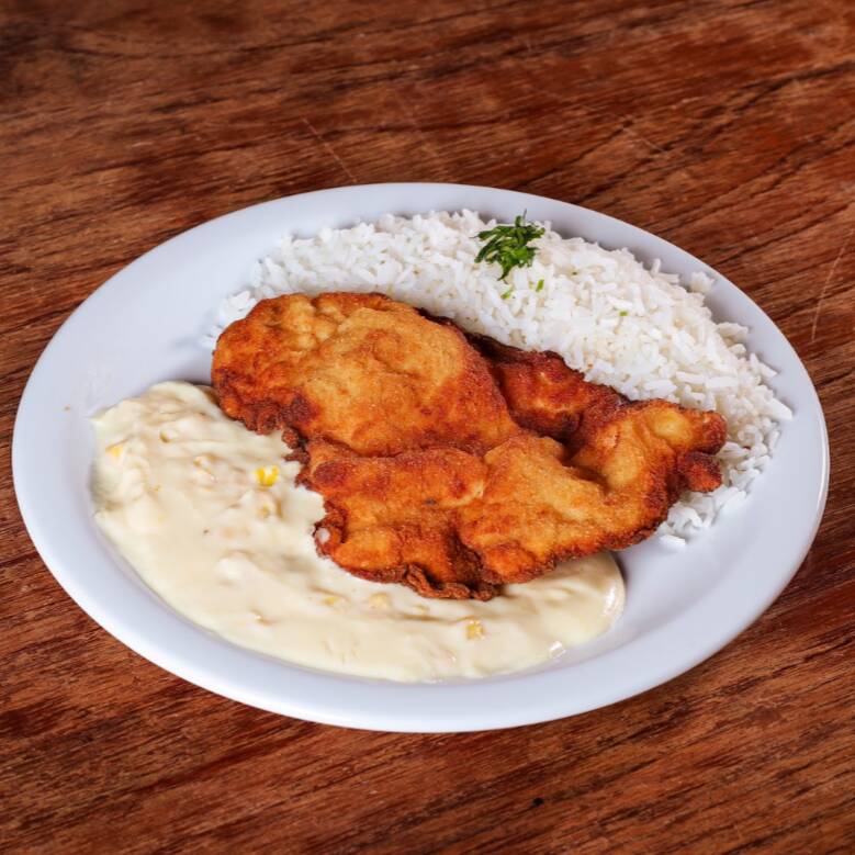 Delicioso frango empanado, acompanhado de arroz, creme de milho e feijão (serve 1 pessoa - aproximadamente 450g)