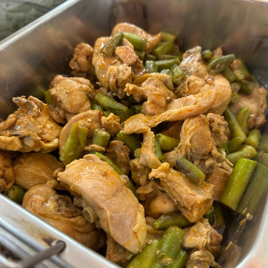 Frango cozido ao molho de tomate com quiabo. Escolha mais 3 acompanhamentos.