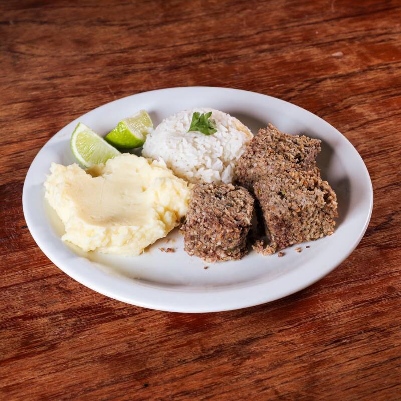 Kibe de forno acompanhado de arroz, feijão da casa e pure de batata (serve 1 pessoa - aproximadamente 400g)