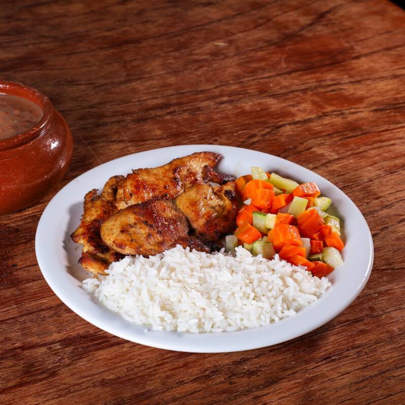 Frango grelhado, acompanhado de arroz, legumes cozidos e feijão (serve 1 pessoa - aproximadamente 450g)