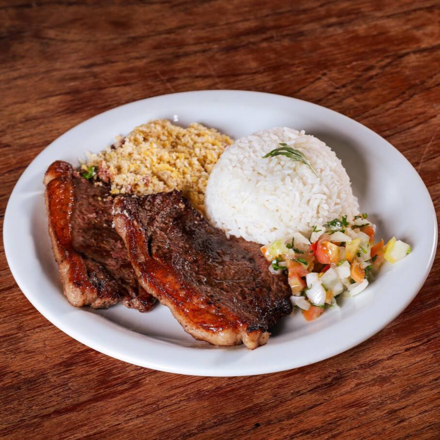 2 Deliciosas fatias de picanha, suculentas, ao ponto do cliente, acompanhadas de arroz, farofa e vinagrete (serve 1 pessoa - aproximadamente 450g)