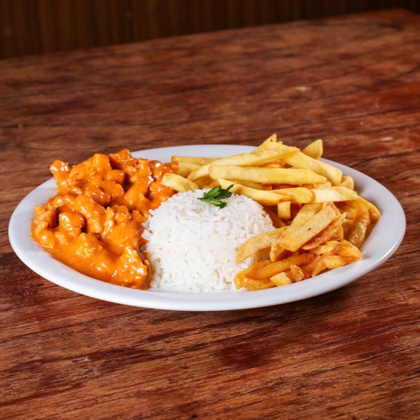Delicioso strogonoff de carne acompanhado de arroz branco e fritas. (serve 1 pessoa - arprox. 500g)