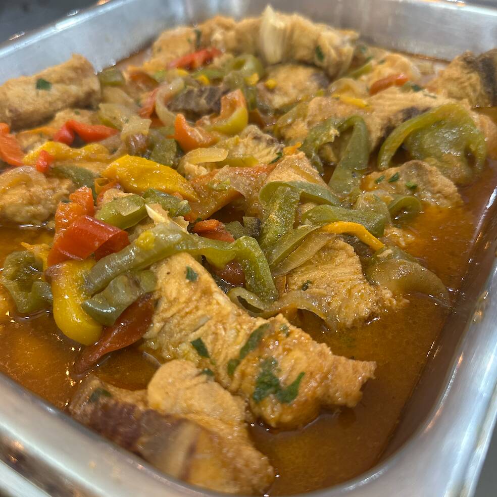 Moqueca de cação com pimentões, cebola, leite de coco e molho de tomate. Acompanha arroz branco e purê de batata.