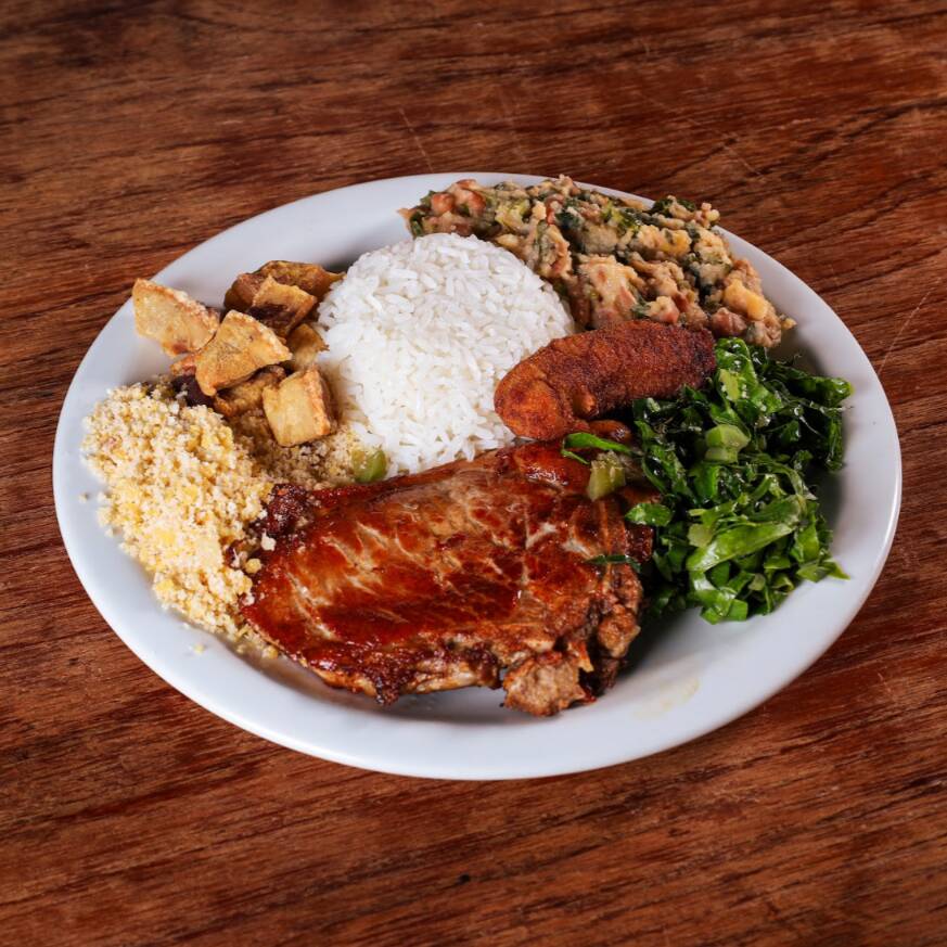 Bisteca de porco, couve refogada, farofa da casa, torresmo crocante, banana a milanesa, arroz e tutu de feijão (serve 1 pessoa - aproximadamente 450g)