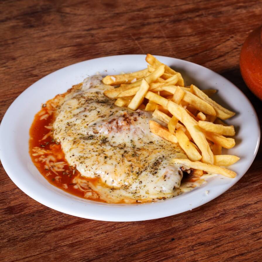 Bife a parmegianna acompanhado de arroz, feijão e fritas (serve 1 pessoa - aproximadamente. 450g)