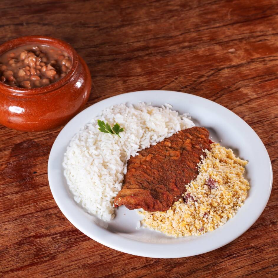Bife a milanesa crocante acompanhado de arroz, feijão e farofa da casa (serve 1 pessoa - aproximadamente. 450g)