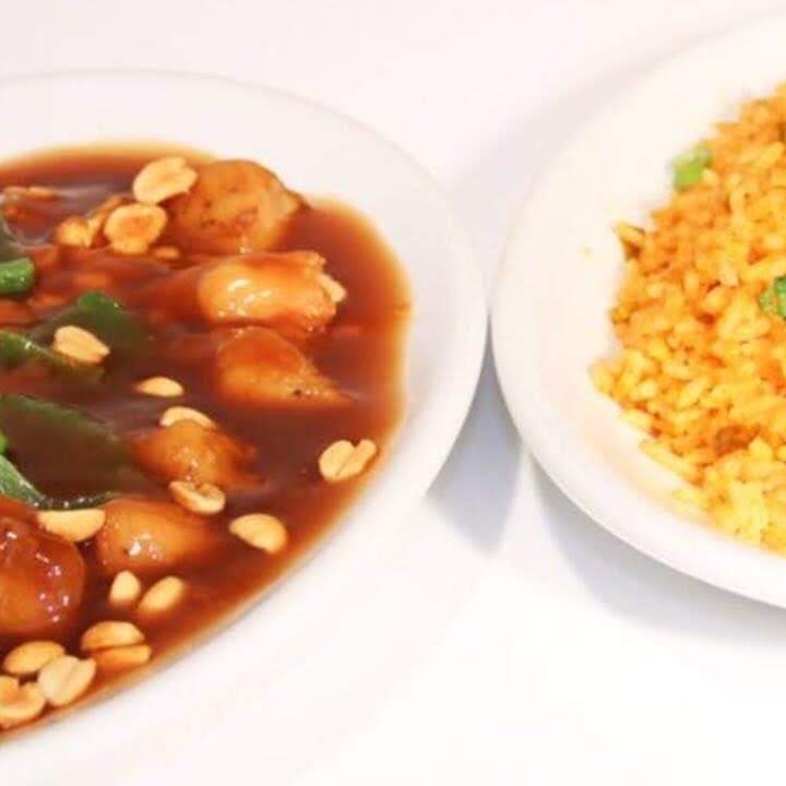 Arroz temperado com frango frito ao molho especial da Eiko com amendoim e pimentão