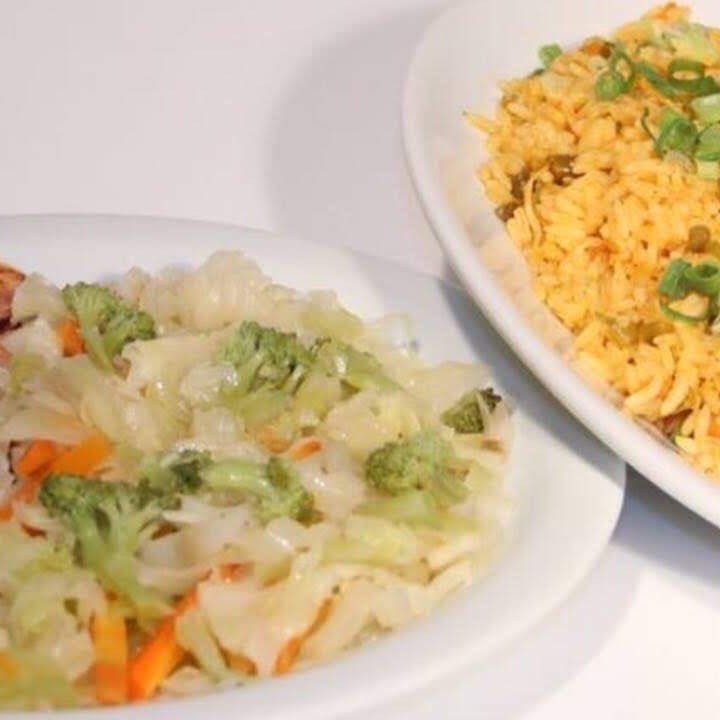 Arroz temperado com carne com molho especial da Eiko e uma mini salada