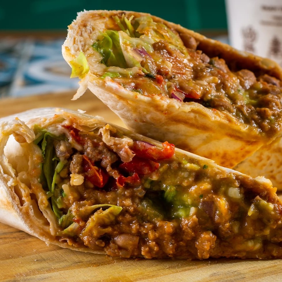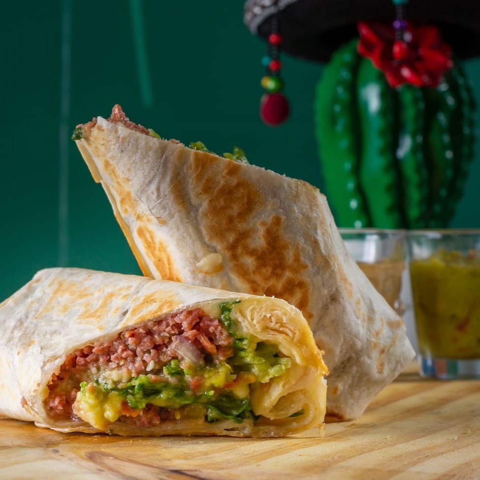 Tortilha de trigo recheada com frijoles refritos, chilli de carne com feijão, mussarela, pico de gallo, guacamole, alface e pimenta biquinho. Burrito de 350 gramas (aproximadamente) + um molho à sua escolha de brinde! (40 ml aproximadamente).