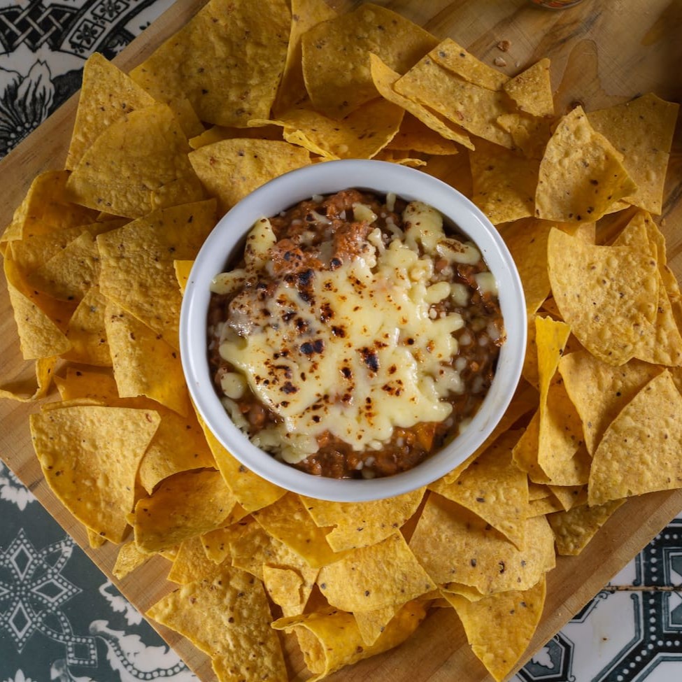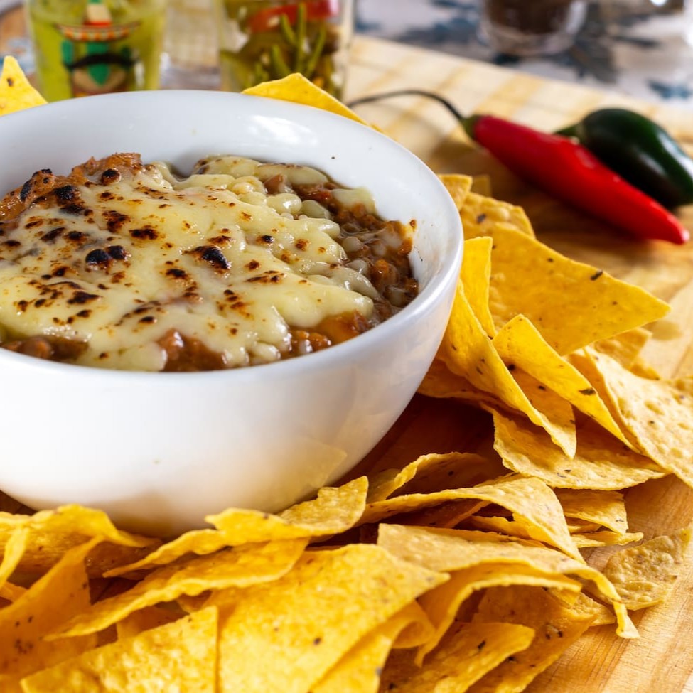 Porção de nachos (70 gramas aproximadamente) com chilli de carne com feijão e queijo mussarela (50 gramas aproximadamente) + 01 molho à sua escolha (molho de 40 ml aproximadamente). Você também pode escolher as opções de Chilli Vegano com feijão ou Chilli Vegetariano com feijão e queijo.