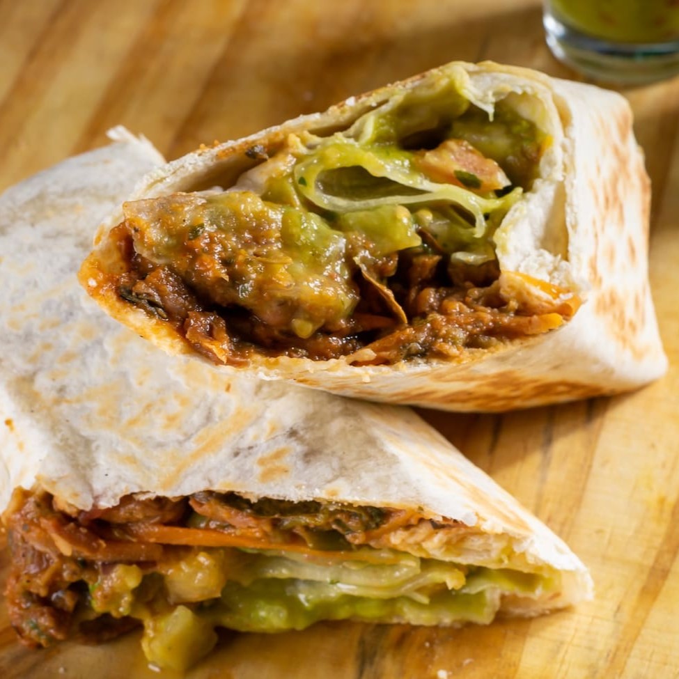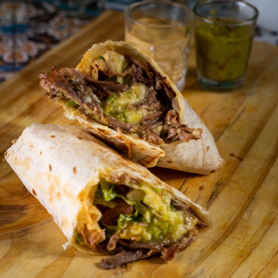 Tortilha de trigo recheada com costela bovina desfiada, mussarela, pico de gallo, guacamole, feijão defumado e alface. Burrito de 350 gramas (aproximadamente) + um molho à sua escolha de brinde! (40 ml aproximadamente). Esse Burrito contém gordura, pois a costela já é uma carne naturalmente gorda. E, é isso que garante seu extremo sabor e suculência.