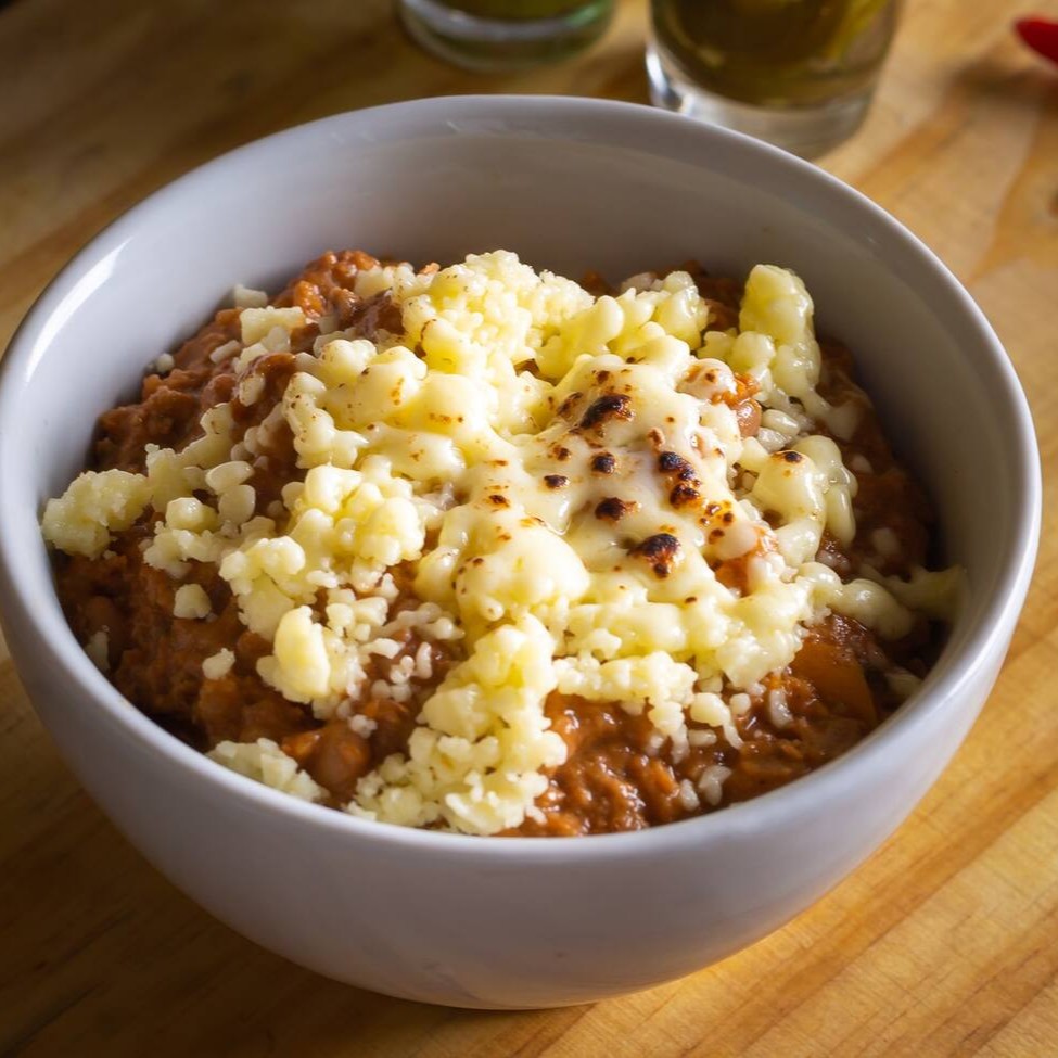 Chilli de Carne com Feijão e Queijo Mussarela! Porção de 350 gramas (aproximadamente)!
