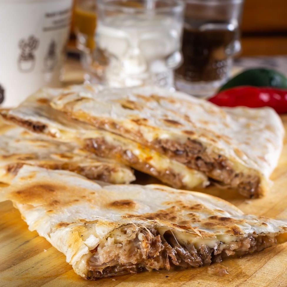 Tortilha de trigo tostada, recheada com queijo mussarela e costela bovina assada desfiada. 04 pedaços de quesadilla + molho à sua escolha (molho de 40 ml aproximadamente).
