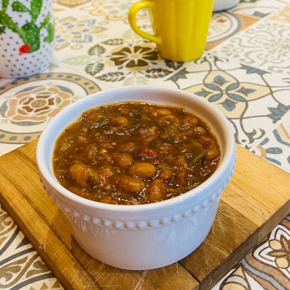Chilli Vegano ou Vegetariano com opção de Queijo Mussarela. Porção com 130 gramas (aproximadamente).