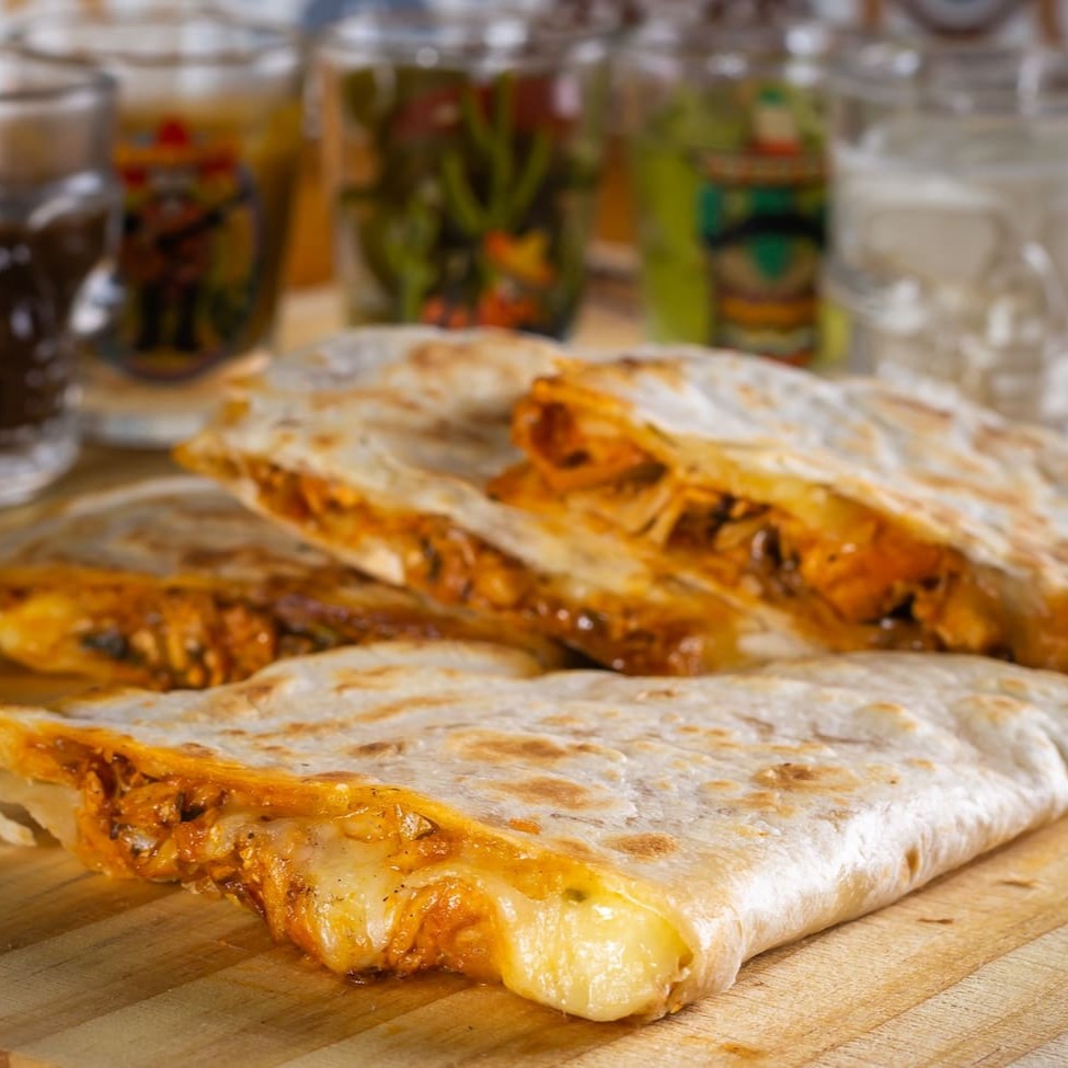 Tortilha de trigo tostada, recheada com queijo muçarela e tiras de frango temperada. 08 pedaços de Quesadilla + molho à sua escolha (molho de 40 ml aproximadamente).