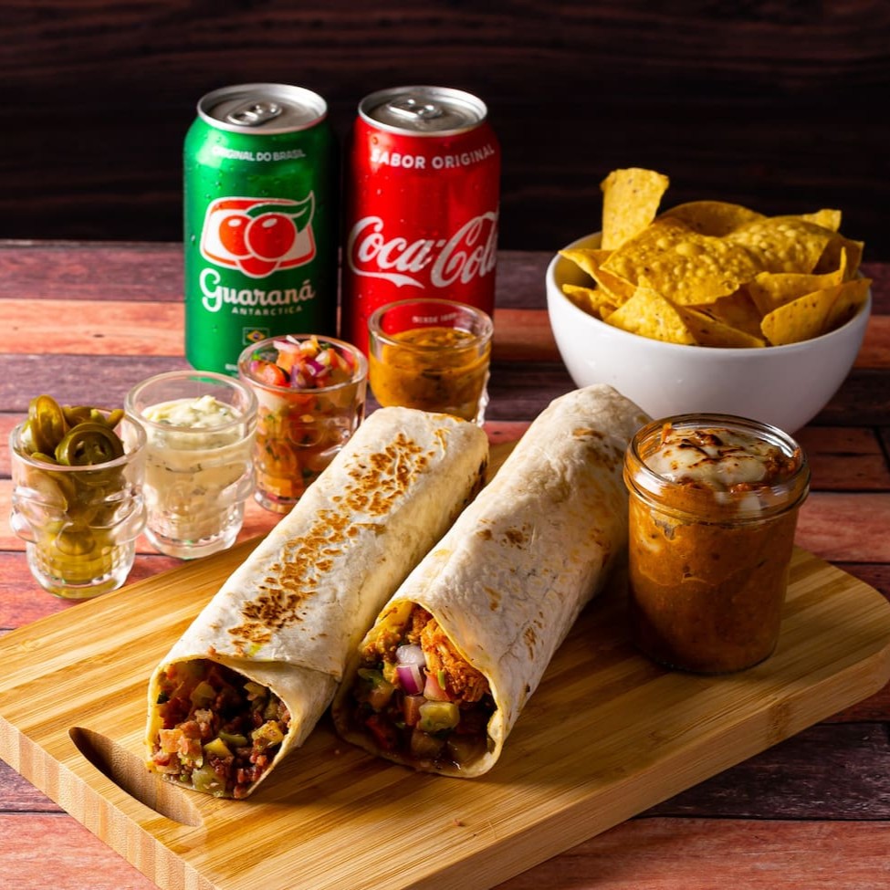 Um combo perfeito para quem ama comida mexicana de verdade! São dois burritos recheados com os ingredientes mais saborosos (escolha seu sabor favorito!), acompanhados de dois molhos adicionais para deixar tudo ainda mais irresistível. Para compartilhar você também leva uma porção generosa de papas calientes crocantes ou nachos com chilli bem temperado, acompanhados de mais dois molhos.