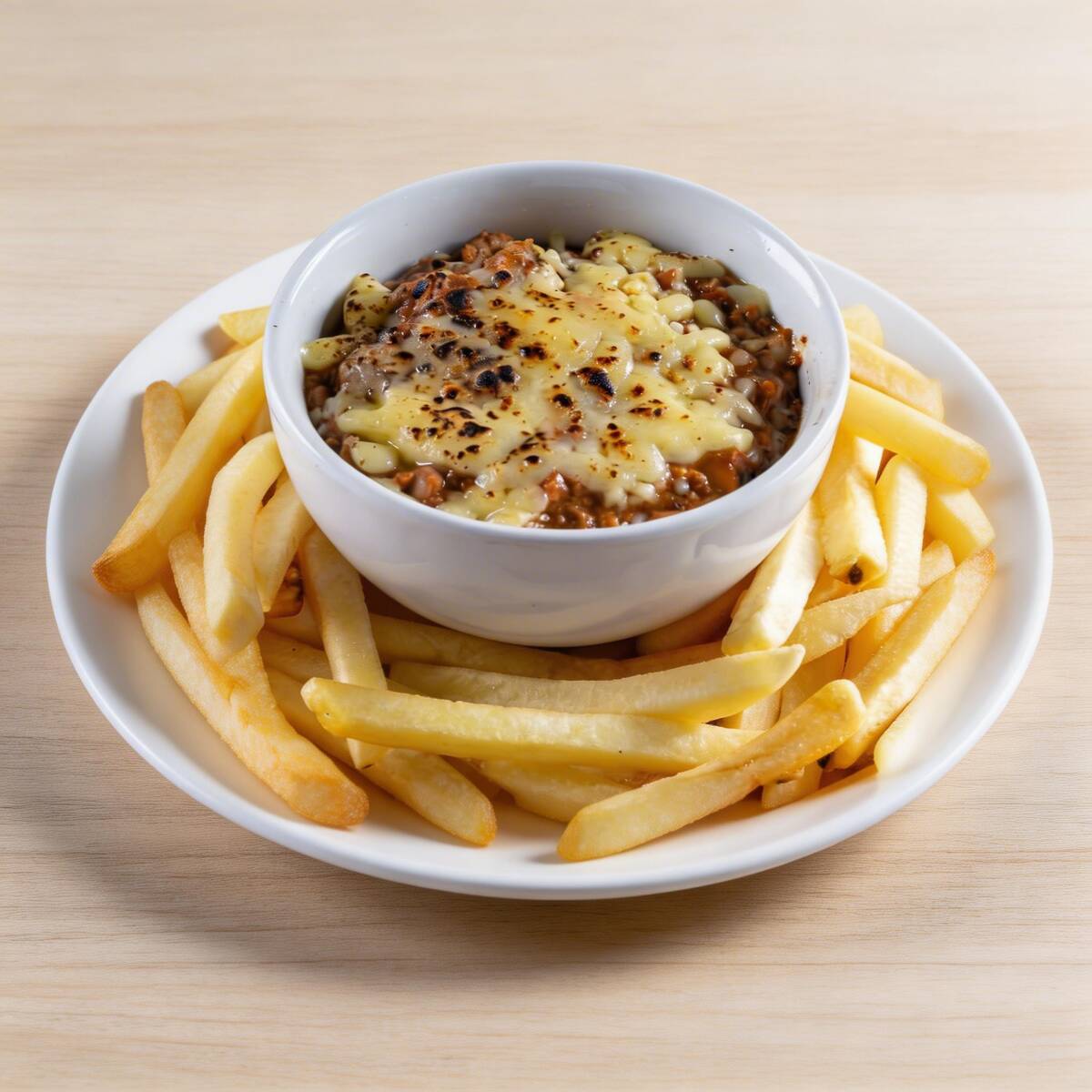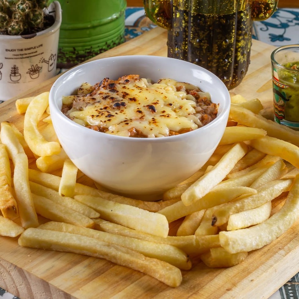 Porção de batata frita (140 gramas aproximadamente) acompanhada de chilli de carne com feijão e queijo mussarela (50 gramas aproximadamente) + 01 molho à sua escolha (molho de 40 ml aproximadamente). Você também pode escolher as opções de chilli vegano com feijão ou chilli vegetariano com feijão e queijo.