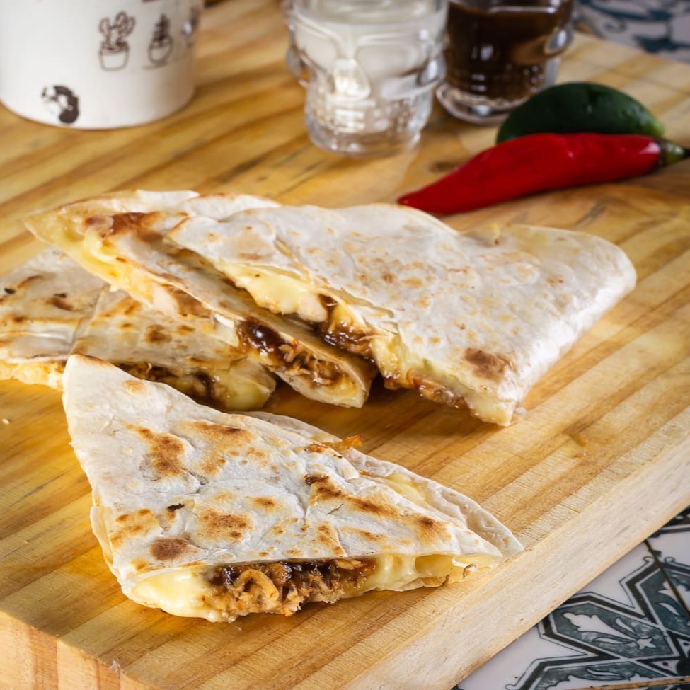 Tortilha de trigo tostada, recheada com queijo mussarela, lombo suíno assado ao molho barbecue artesanal. 04 pedaços de quesadilla + molho à sua escolha (molho de 40 ml aproximadamente).