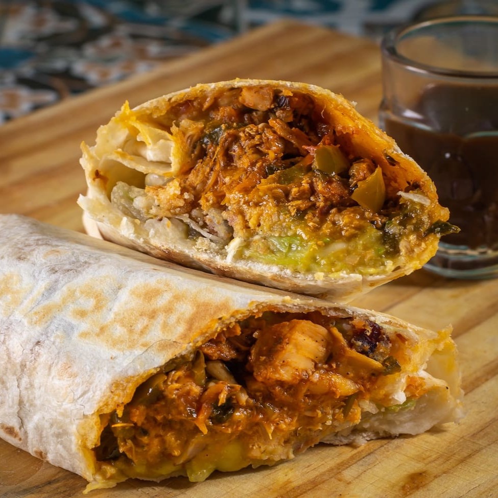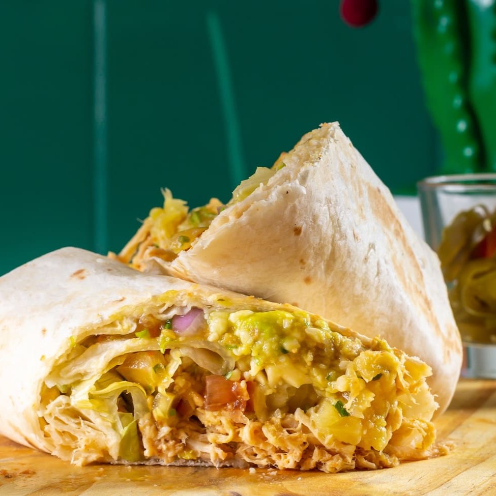 Tortilha de trigo recheada com frijoles refritos, frango em tiras temperado, mussarela, sour cream, pico de gallo, guacamole, alface e farofa de bacon. Burrito de 350 gramas (aproximadamente) + um molho à sua escolha de brinde! (40 ml aproximadamente).