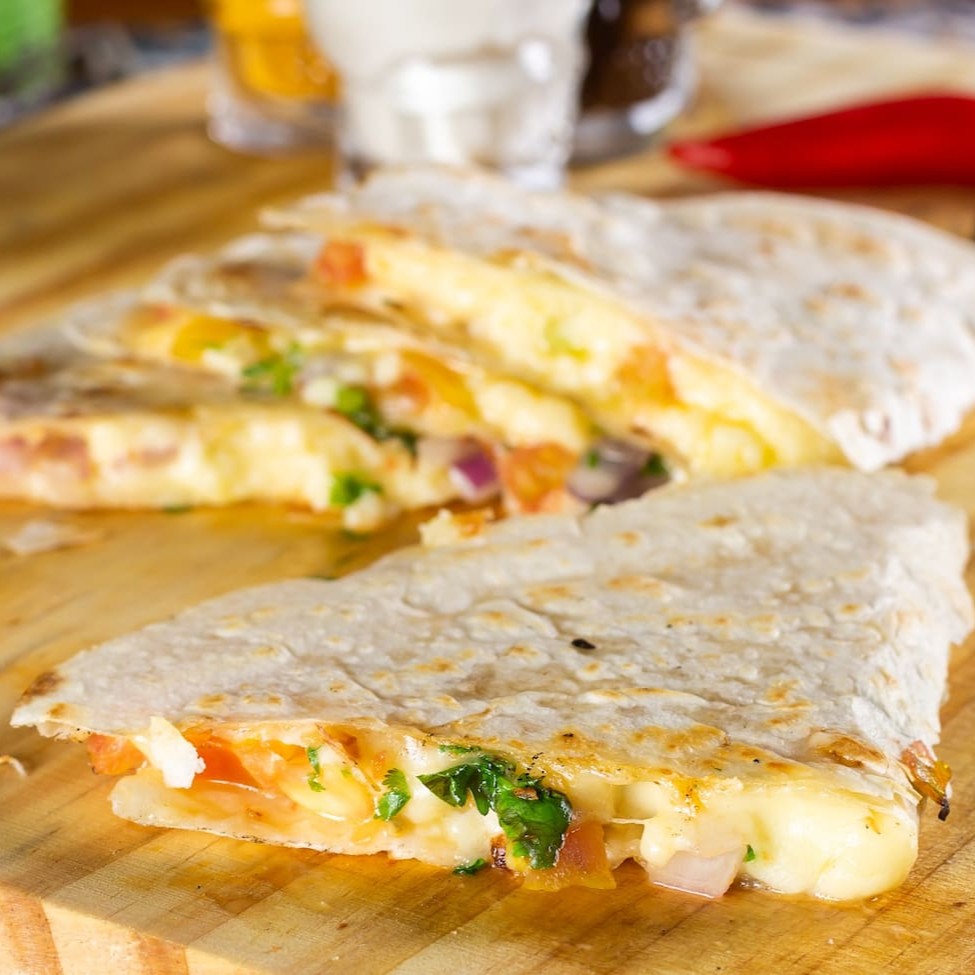 Tortilha de trigo tostada, recheada com queijo mussarela e chilli de carne com feijão. 08 pedaços de quesadilla + molho à sua escolha (molho de 40 ml aproximadamente).