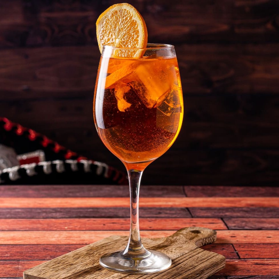 Drink à base de Aperol, espumante, água com gás, laranja e gelo. Possui álcool.