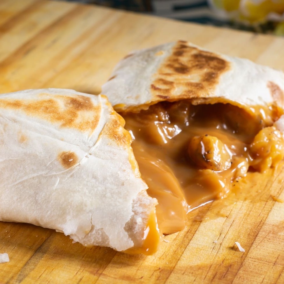 *Mini Burrito* Tortilha de trigo recheada com doce de leite artesanal, abacaxi grelhado e canela. Burrito de 120 gramas (aproximadamente).
