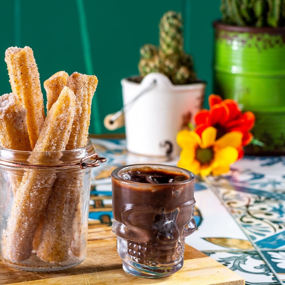 Porção com 12 Churros Espanhóis de 12 centímetros, salpicados com açúcar e canela + calda de doce de leite ou brigadeiro de colher.