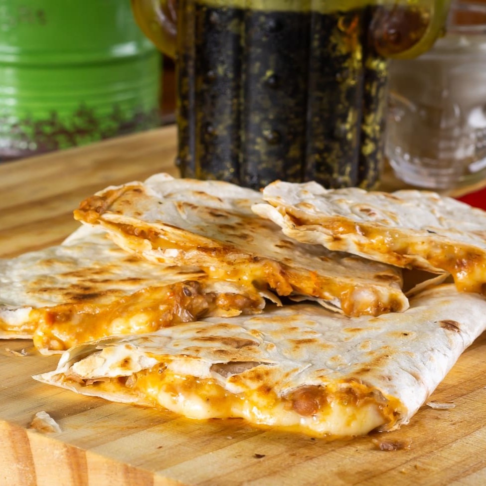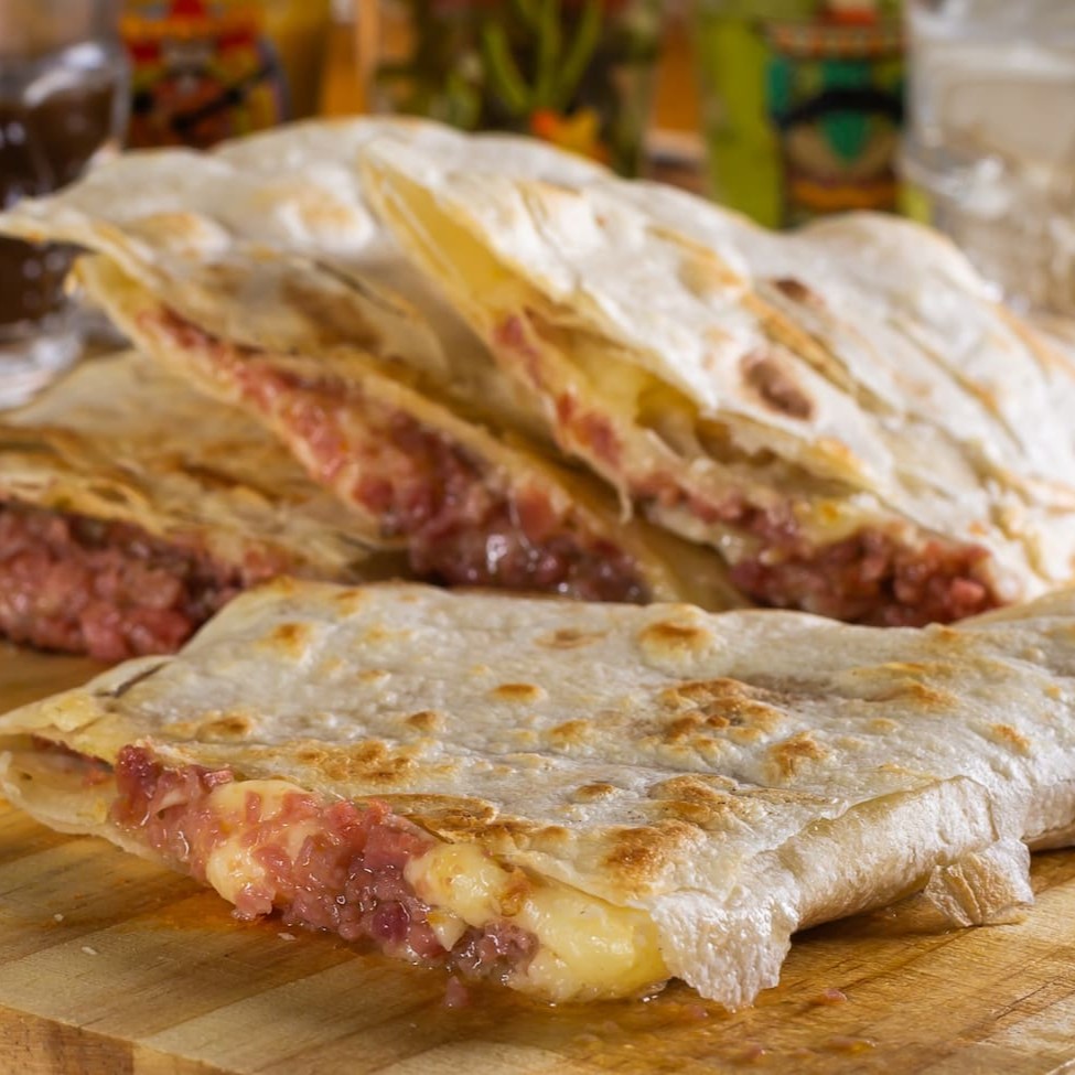 Tortilha de trigo tostada, recheada com queijo mussarela e chilli de carne com feijão. 08 pedaços de quesadilla + molho à sua escolha (molho de 40 ml aproximadamente).