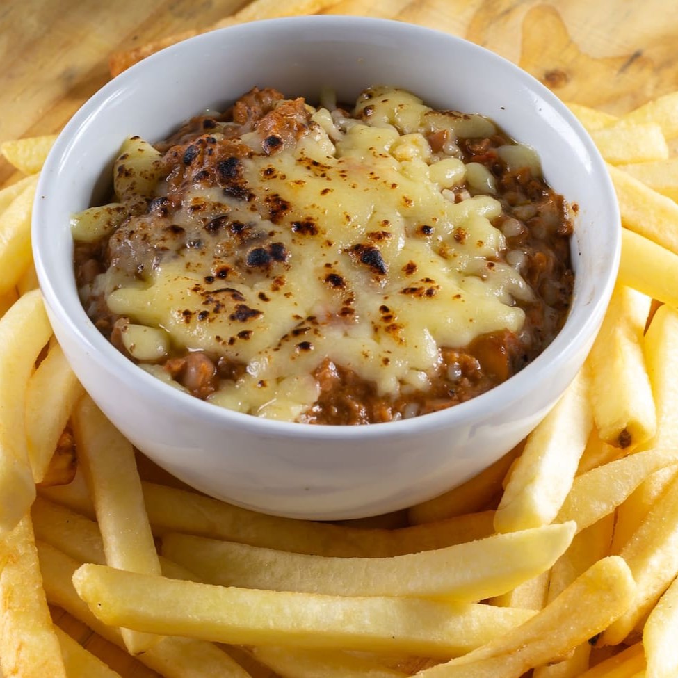 Porção de batata frita (140 gramas aproximadamente) acompanhada de chilli de carne com feijão e queijo mussarela (130 gramas aproximadamente) + 01 molho à sua escolha (molho de 40 ml aproximadamente). Você também pode escolher as opções de Chilli Vegano com feijão ou Chilli Vegetariano com feijão e queijo.