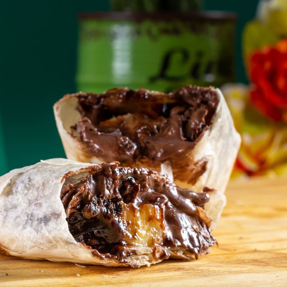 *Mini Burrito* Tortilha de trigo recheada com Nutella e chocolate Bis e Banana (banana é opcional). Burrito de 120 gramas (aproximadamente).