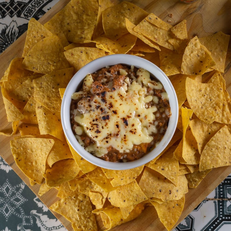 Porção de nachos (100 gramas aproximadamente) com chilli de carne com feijão e queijo mussarela (130 gramas aproximadamente) + 02 molhos à sua escolha (molhos de 40 ml cada, aproximadamente). Você também pode escolher as opções de chilli vegano com feijão ou chilli vegetariano com feijão e queijo.