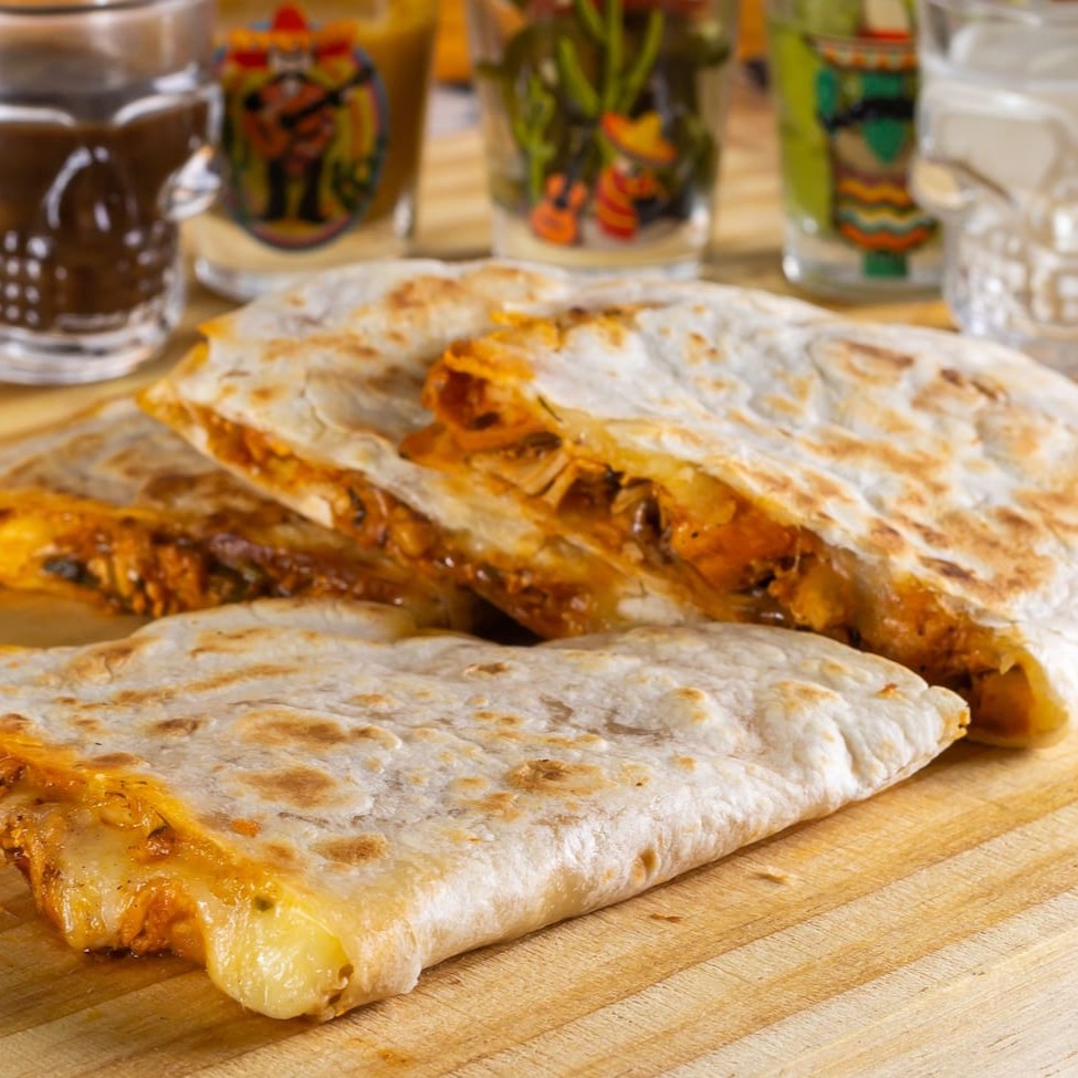 Tortilha de trigo tostada, recheada com queijo mussarela e tiras de frango temperado. 04 pedaços de quesadilla + molho à sua escolha (molho de 40 ml aproximadamente).