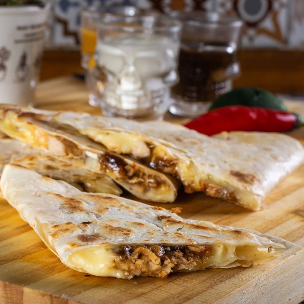 Tortilha de trigo tostada, recheada com queijo mussarela, lombo suíno assado ao molho barbecue artesanal. 04 pedaços de quesadilla + molho à sua escolha (molho de 40 ml aproximadamente).