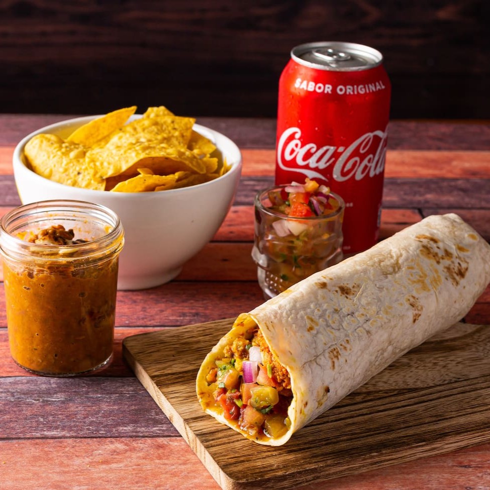 O combo perfeito para uma pessoa! Uma combinação perfeita para matar a fome com muito sabor! Escolha um delicioso burrito (qualquer sabor), acompanhado de um molho adicional para realçar ainda mais o sabor. Para completar, uma porção pequena de nachos crocantes com chilli bem temperado ou papas calientes douradinhas e sequinhas, também com um molho extra. E para refrescar, escolha sua bebida fa