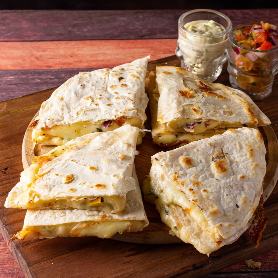 Tortilha de trigo tostada, recheada com queijo mussarela, calabresa moída e cebola. 08 pedaços de quesadilla + molho à sua escolha (molho de 40 ml aproximadamente).
