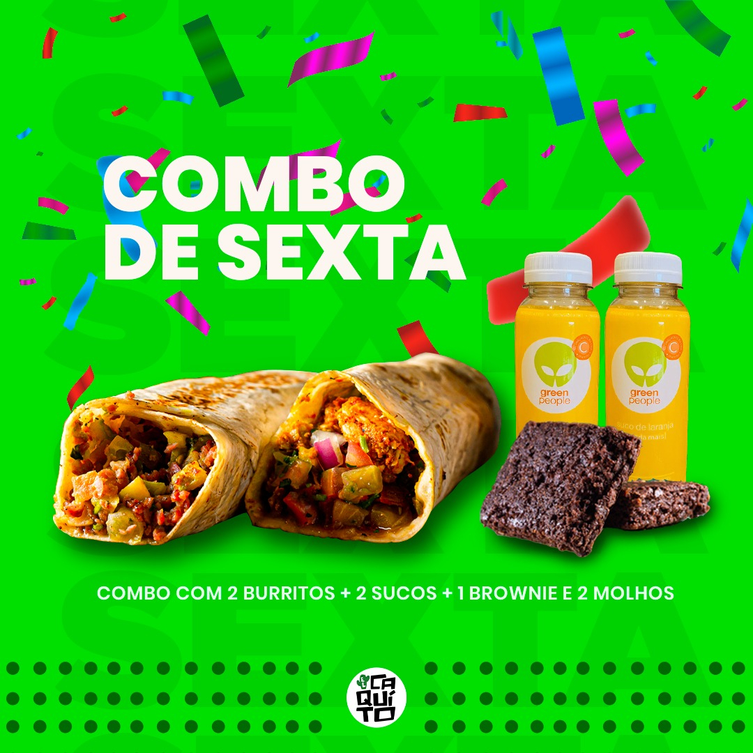 Combo composto por 2 deliciosos burritos (qualquer sabor), 2 molhos artesanais, 2 Sucos Naturais Green People + 2 Brownies Veganos! Combo recomendado para duas pessoas.