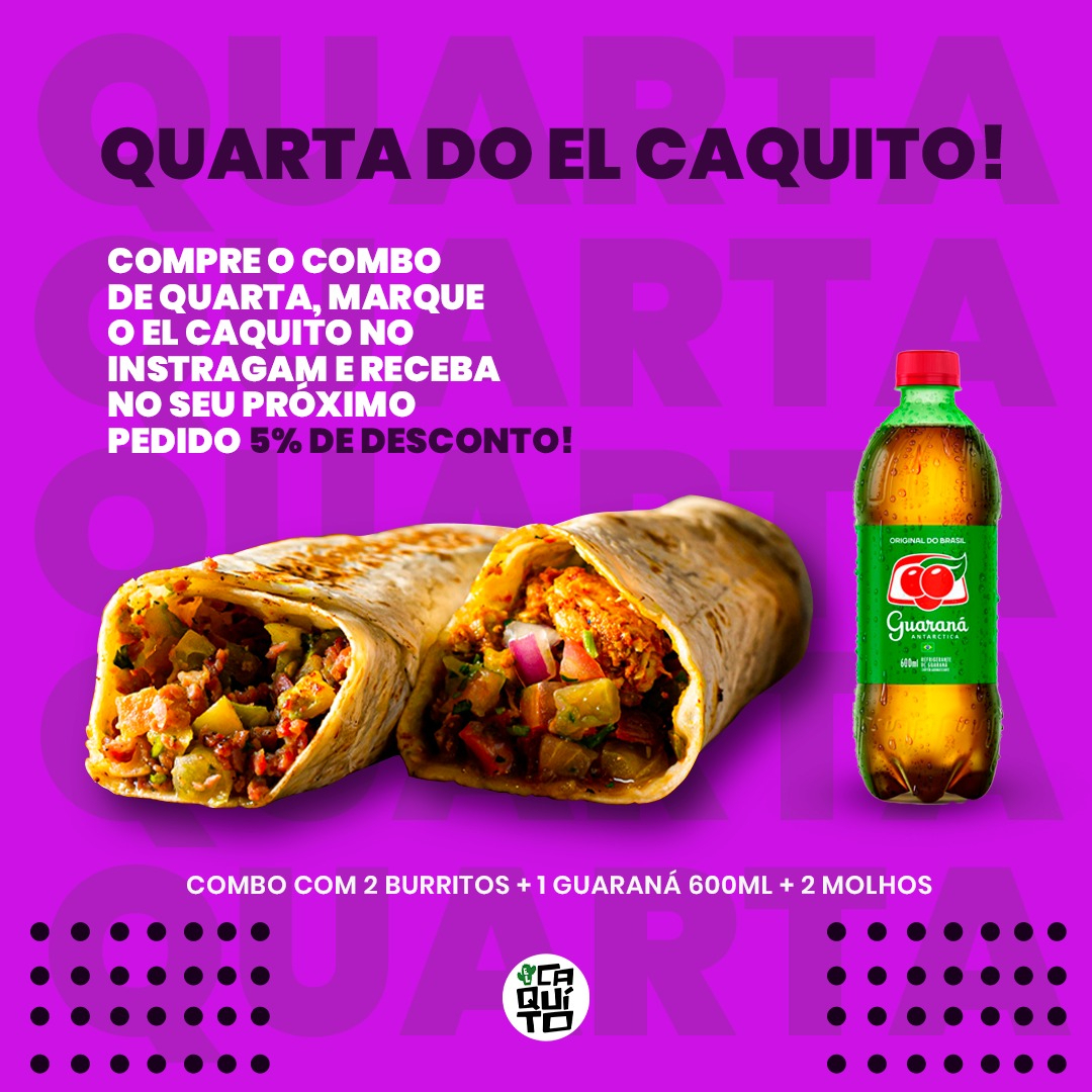 Nesta promo você escolhe dois deliciosos burritos (qualquer sabor) + dois molhos artesanais e ainda leva um Guaraná Antarctica de 600 ml.