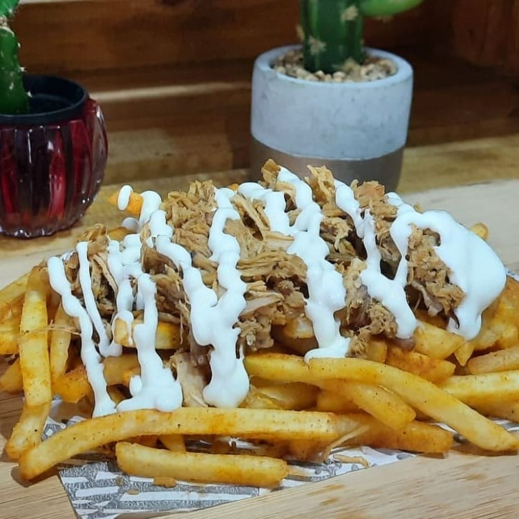 Este prato encantador da categoria 'Tex Mex' apresenta uma deliciosa meia porção de batatas fritas, adoravelmente temperadas ao estilo texano. Acompanha uma generosa porção de 'Pulled Pork', uma suculenta copa de lombo meticulosamente temperada com nosso exclusivo dry rub da casa e defumada à perfeição em lenha frutífera, garantindo um sabor inigualável. Para completar, oferecemos um toque de crem