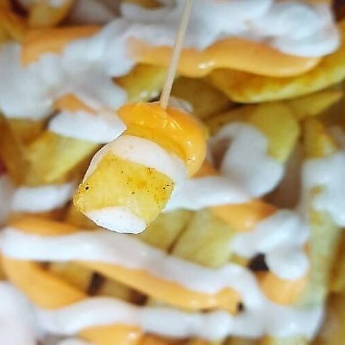 Meia porção de batata corte fino com nosso temperinho secreto do chefe. Deliciosa! As batatas fritas são cobertas com requeijão tipo cheddar e sour cream, que é uma mistura de creme de leite azedo com limão e iogurte. É uma combinação muito popular, cremosa e azedinha!! Atenção, porção vendida já montada.