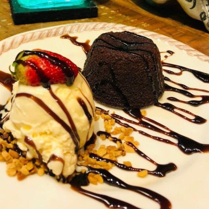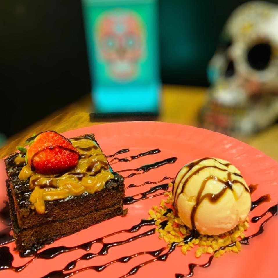 Brownie de 50g coberto com doce de leite cremoso, acompanha sorvete de creme