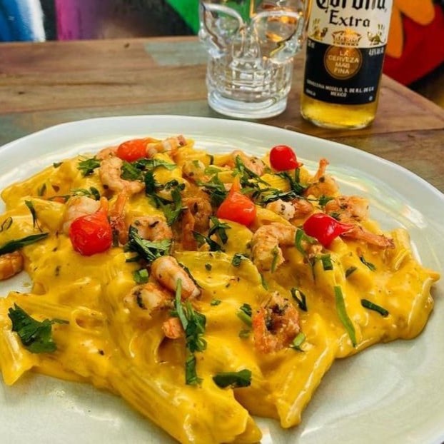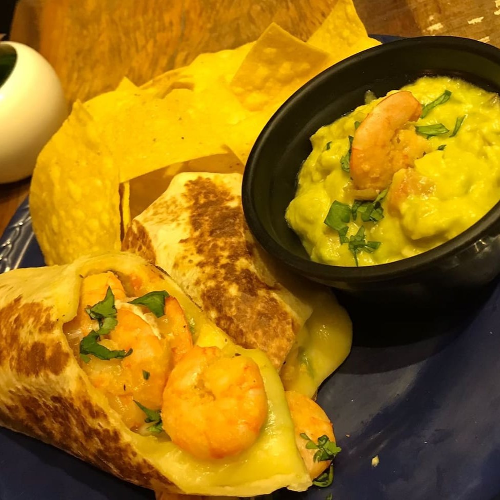 Camarão rosa ao molho de tequila, acompanha tortilhas com queijo e cebolinha.