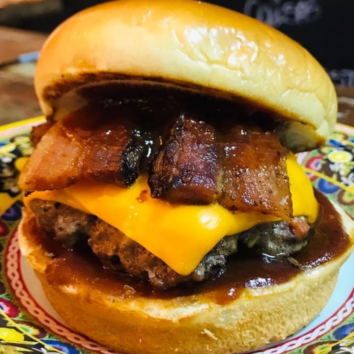 Hambúrguer de costela 120gr, queijo cheddar, barbecue e bacon
