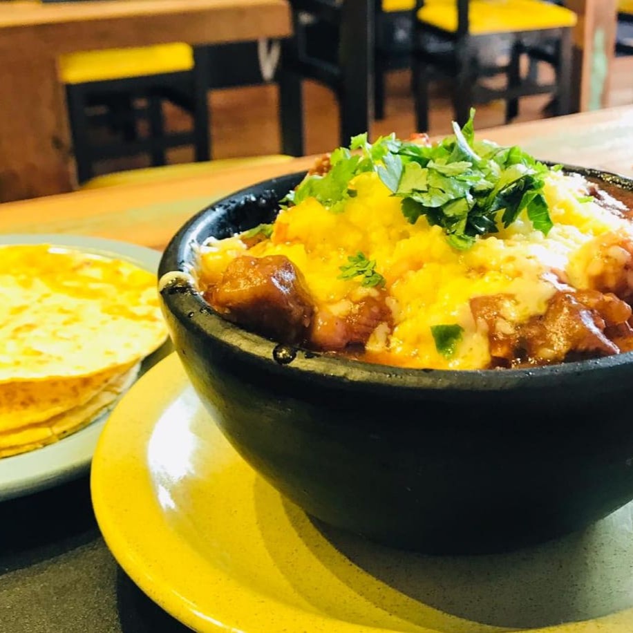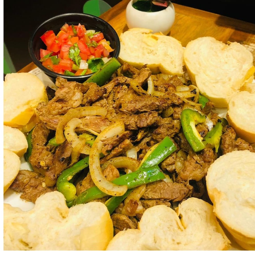 Prato tradicional mexicano preparado com carne e frango em cubos, pimentão, cebola e queijo. Acompanha guacamole, chilli e 8 tortilhas :)