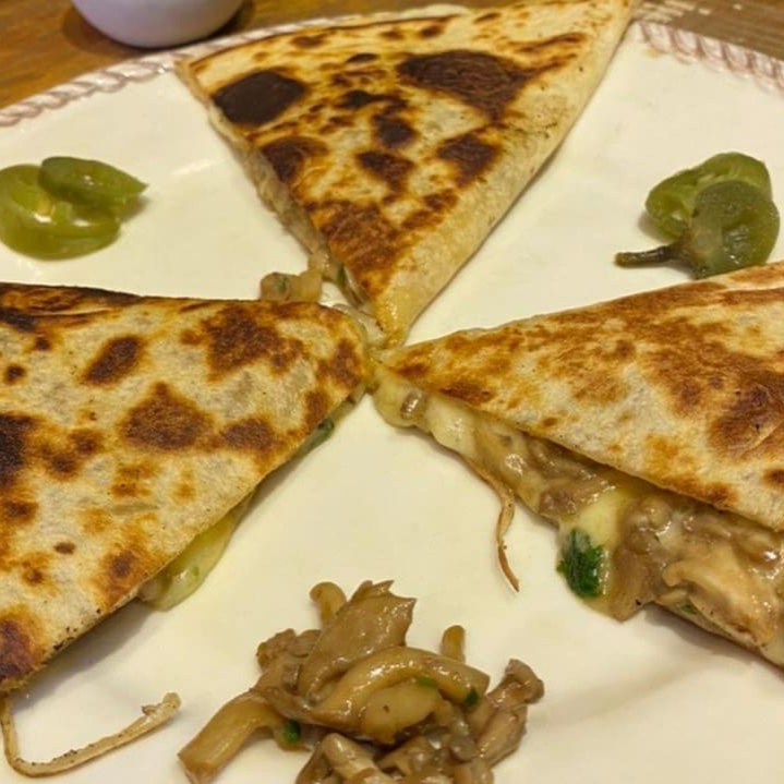 Quesadilla de queijo, abobrinha e shimeji, servida em 3 pedaços. Caso queira apimentado, avise-nos!