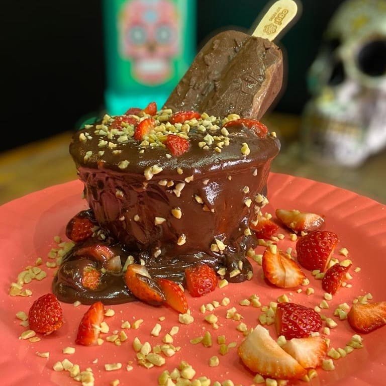 Taco recheado com morangos, chocolate ao leite, sorvete e chantilly