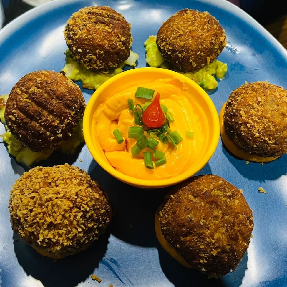 Massa de chilli com recheio de mussarela, empanada na farinha de nachos. 5 unidades, acompanha molho cheddar :)