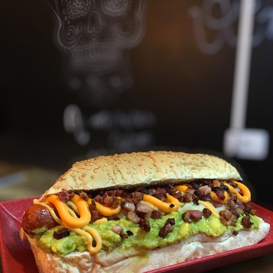 Super pão com gergelim, 2 salsichas, bacon, guacamole, queijo mussarela ralado, molho especial, cheddar, pimenta jalapenõ.