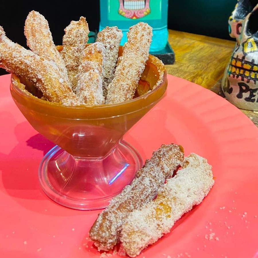 8 mini churros acompanhado de um delicioso doce de leite ou chocolate.