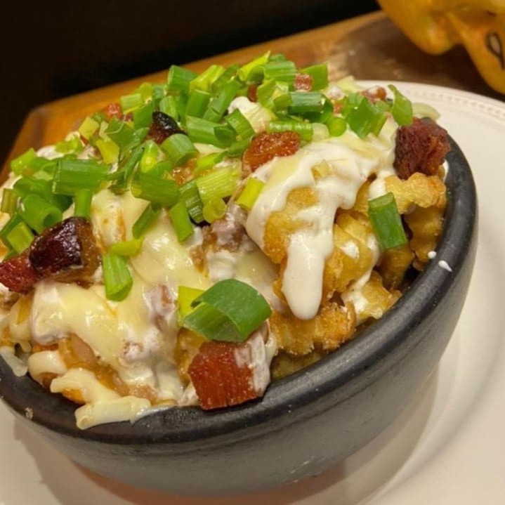 Batata crinckle, queijo mussarrela ralado, bacon, cheddar e molho especial.