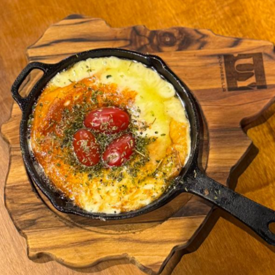 Queijo Provolone no ferro concluído com tomate cereja e orégano. Aprox. 200g